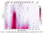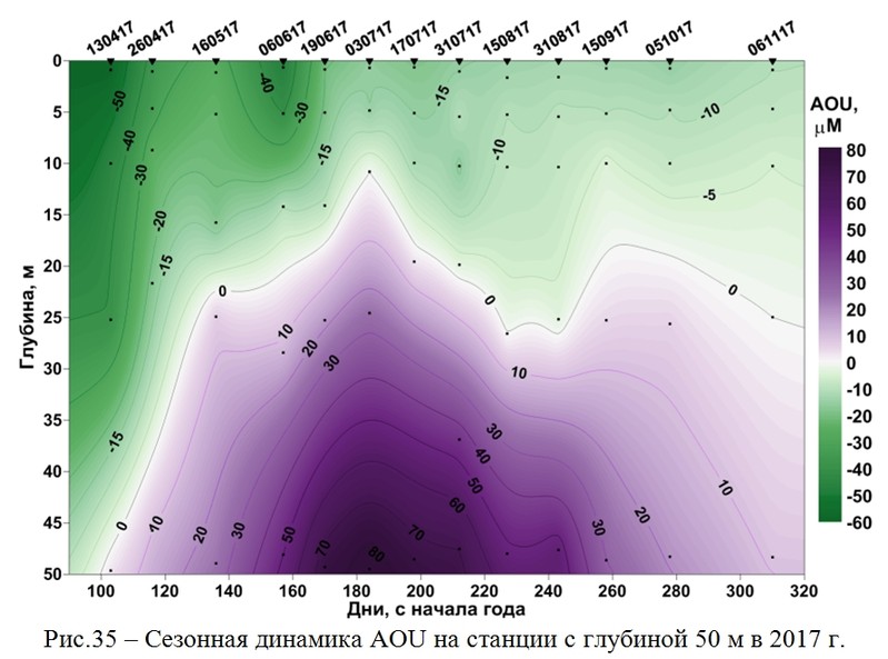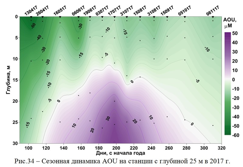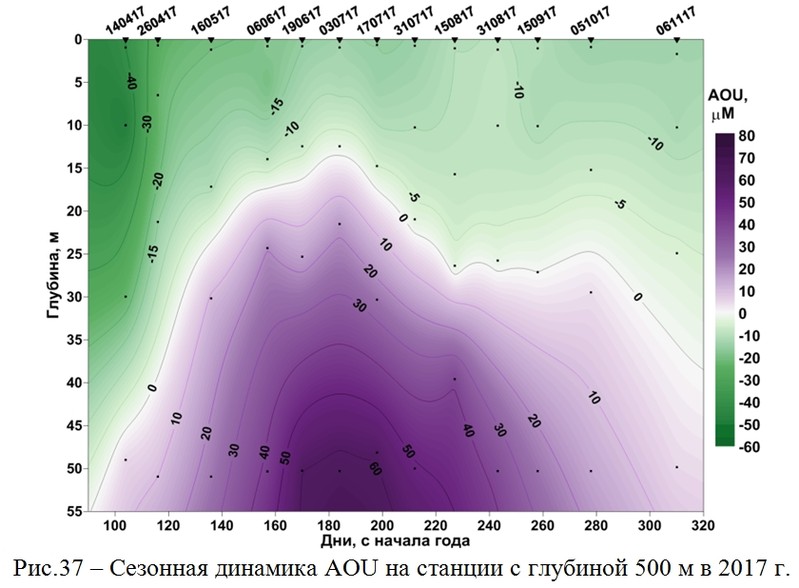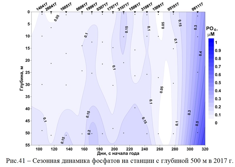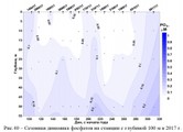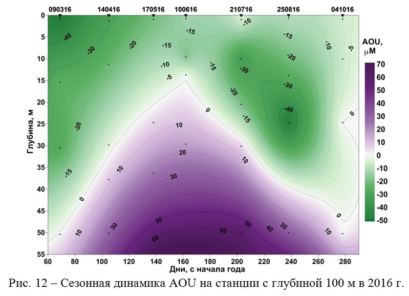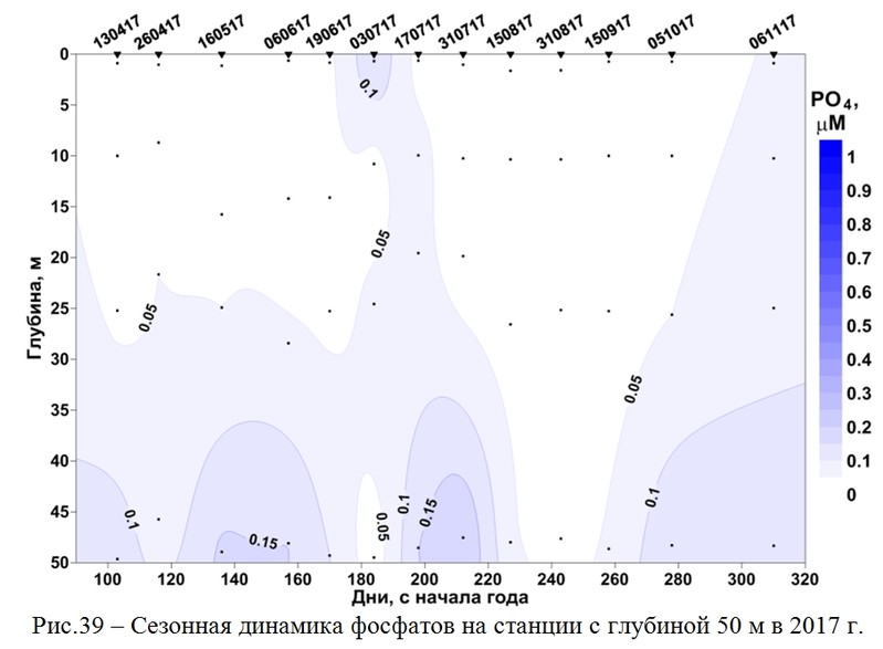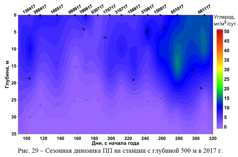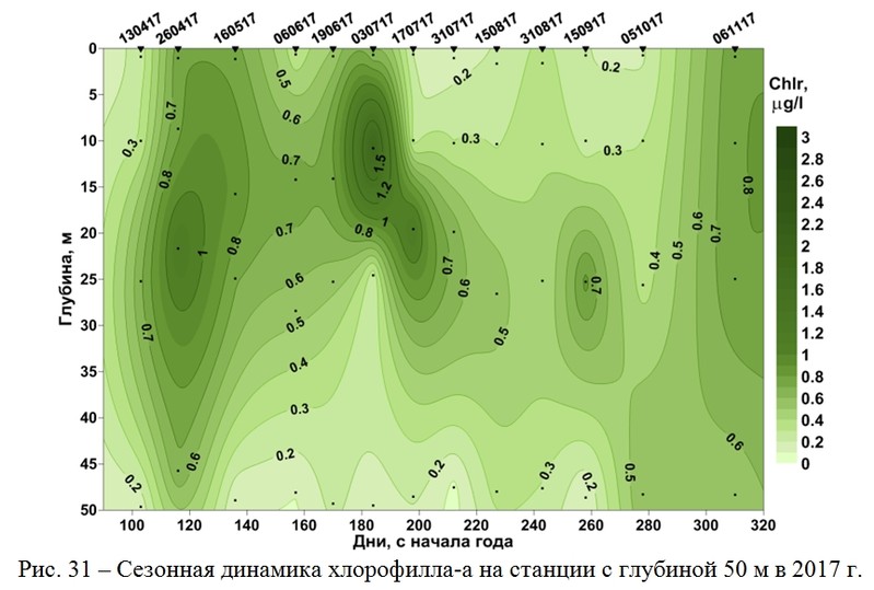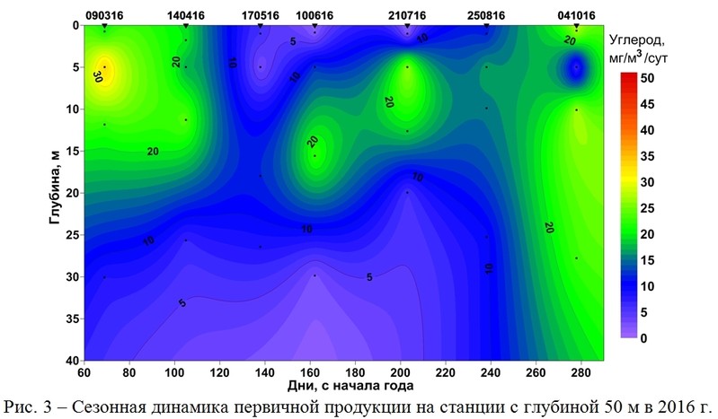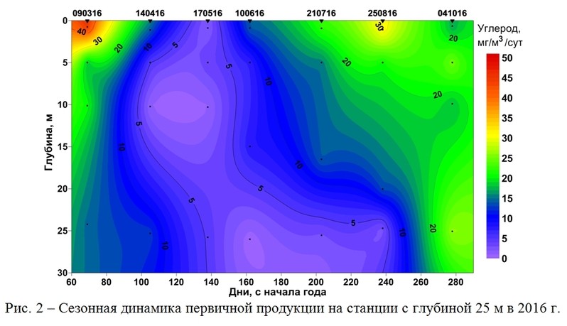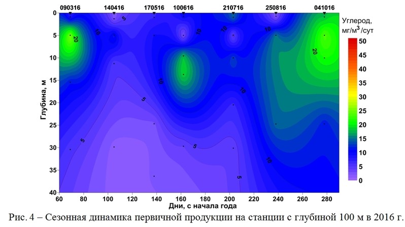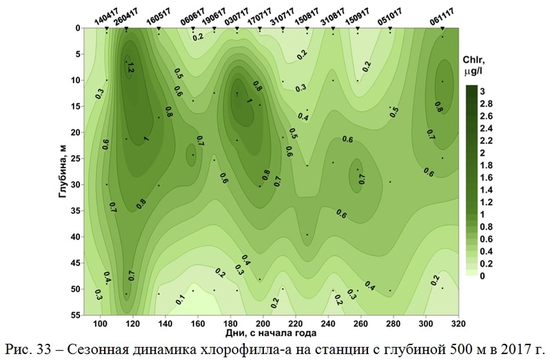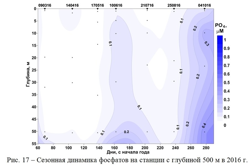 Резонно предположить, что именно по причине лимитирования кремния был получен высокий коэффициент корреляции между взвещенным содержанием кремния и взвешенной величиной первичной продукции в 2016 году. Появление ХПС в 2017 году восполнило нехватку кремния в эвфотическом слое. В течение года содержание кремния варьировалось от 0.54 до 10.81 μM. Согласно рассчитанному Редфилдовскому соотношению, в 2017 году азот и фосфор снова выступили в роле лимитирующих биогенных элементов (в верхнем 50-м слое отношение Si:N в среднем составляло 9, а Si:P ~ 82). Поскольку сукцессия фитопланктона, управляемая отношением азота к фосфору, более сложная, можно предположить, что именно это послужило причиной расхождения в сезонной динамике ПП и хлорофилла-а, а также АОU и хлорофилла-а в 2017 году.
