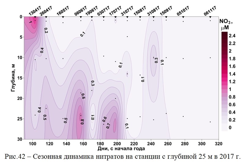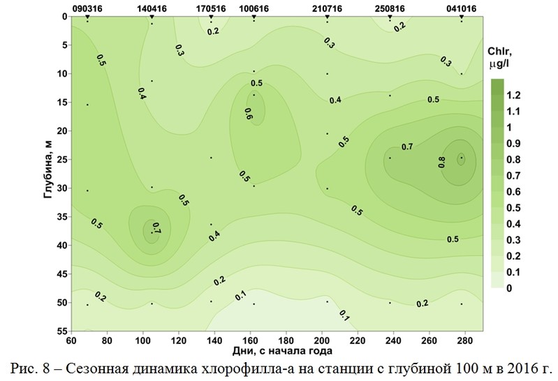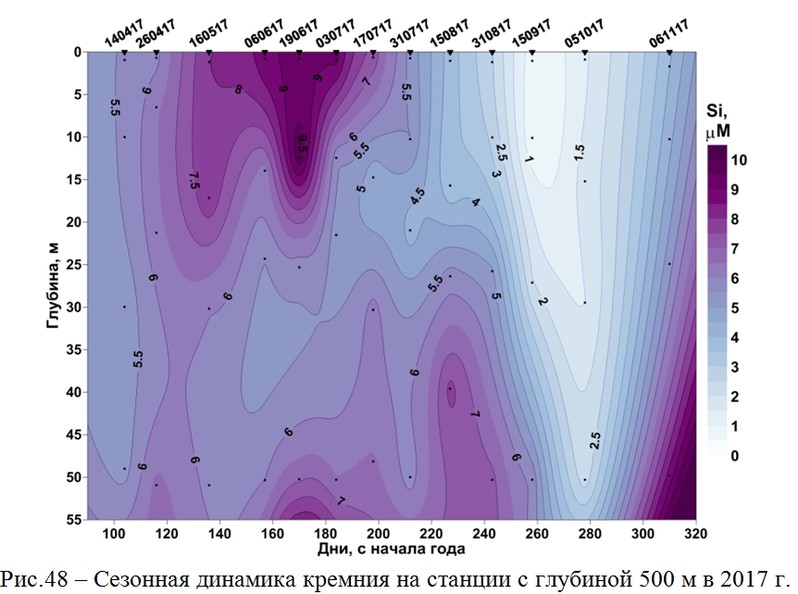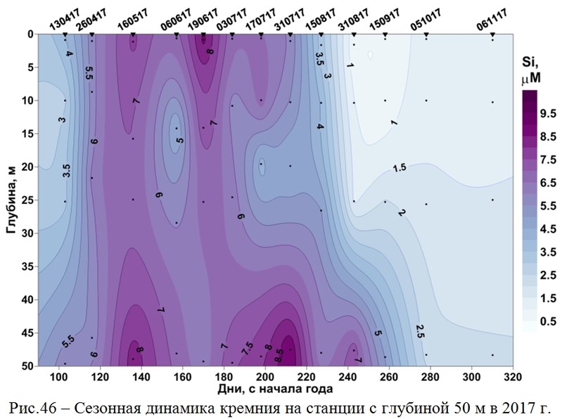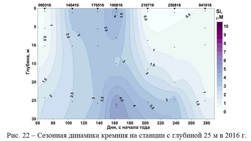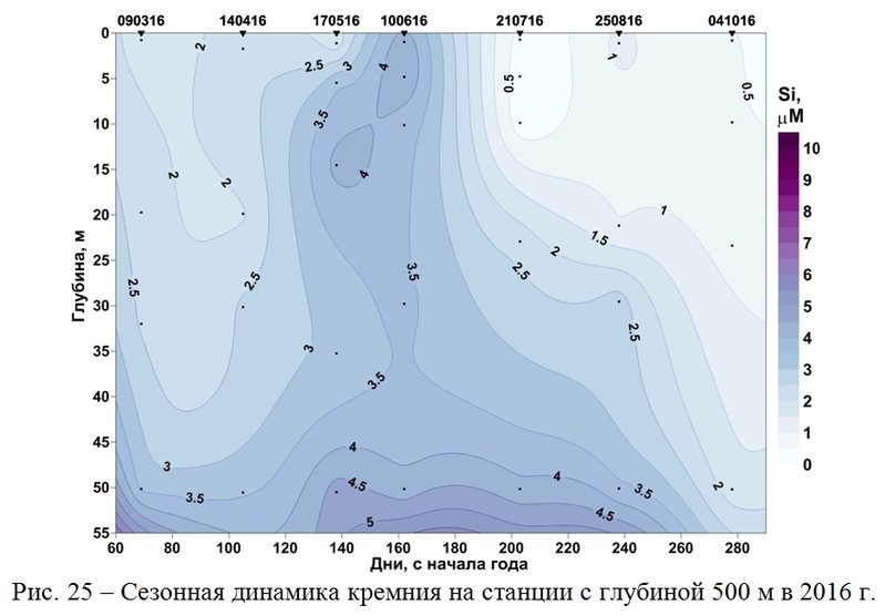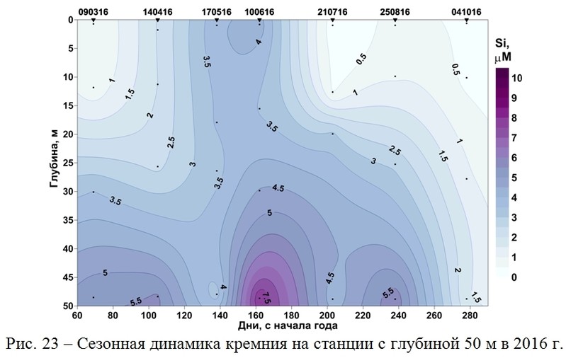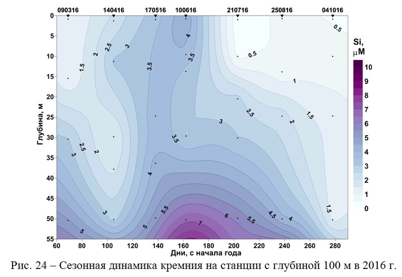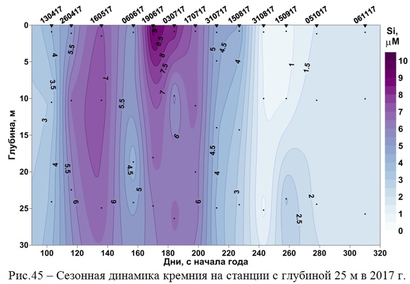 Подобное содержания кремния совершенно нетипично для северо-восточной части Черного моря, где сезонная сукцессия фитопланктона зависит от соотношения азота к фосфору, поскольку кремний в черноморских водах содержится в избытке [Силкин и др., 2011; Паутова и др., 2011].