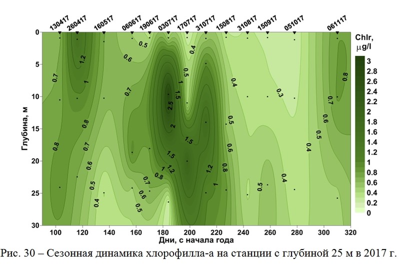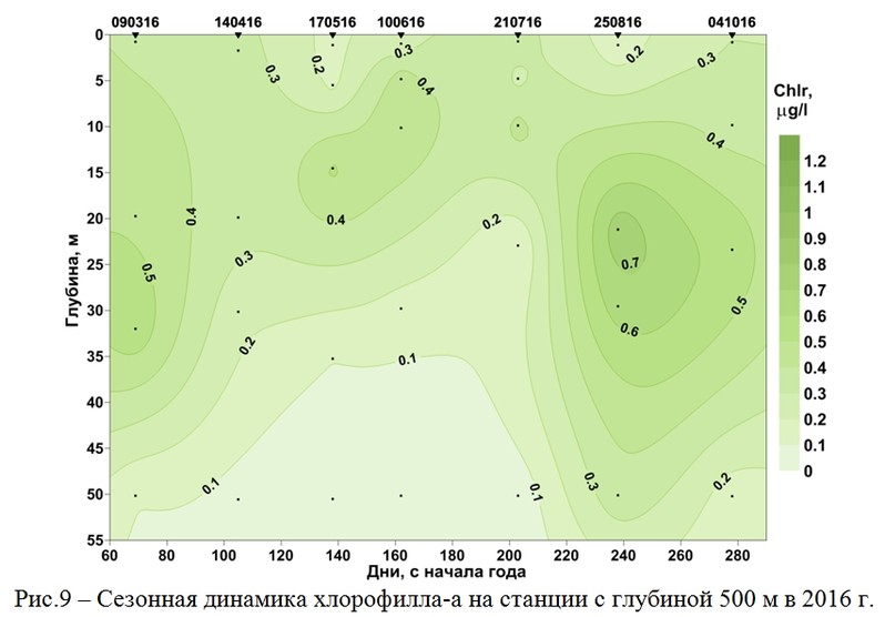слой) с 2014 по 2016 год включительно. ХПС формируется во время зимнего перемешивания в центральных районах моря, и его воды, богатые кислородом и биогенными элементами, поступают в исследуемый район примерно с апреля по июль. Верхняя граница ХПС находится на горизонте 40-60 м, а толщина варьируется из года в год, и после особо холодных зим может превышать 100 м. По мере прогрева толщина ХПС уменьшается к концу года, вплоть до полного исчезновения этого слоя. ХПС несет важную функцию снабжения эвфотического слоя биогенными элементами в теплый период времени.