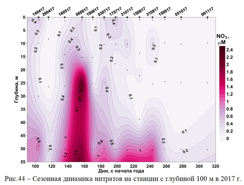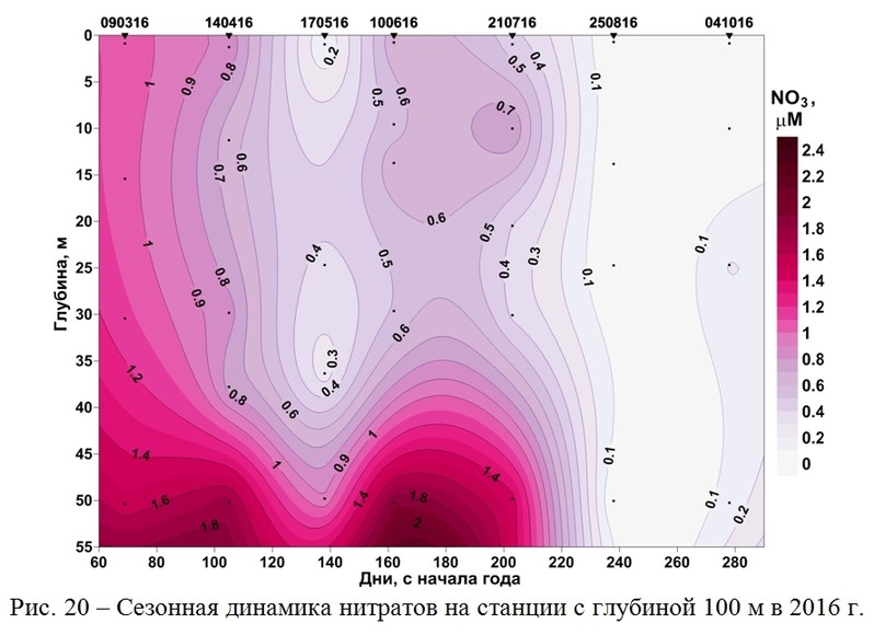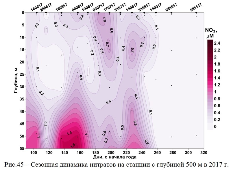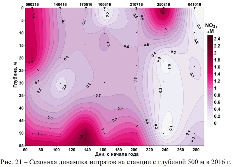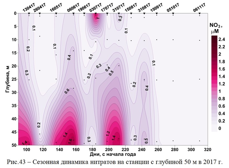 Поскольку рециклинг кремния занимает больше времени, чем круговорот фосфора и азота, а материковый сток в изучаемом районе не столь значителен (Джаошвили, 2003), глубинные воды являются основным источником поступления кремния в более высокие слои. За счет ветрового перемешивания происходит обогащение фотического слоя биогенными элементами, поступающими из ХПС.
